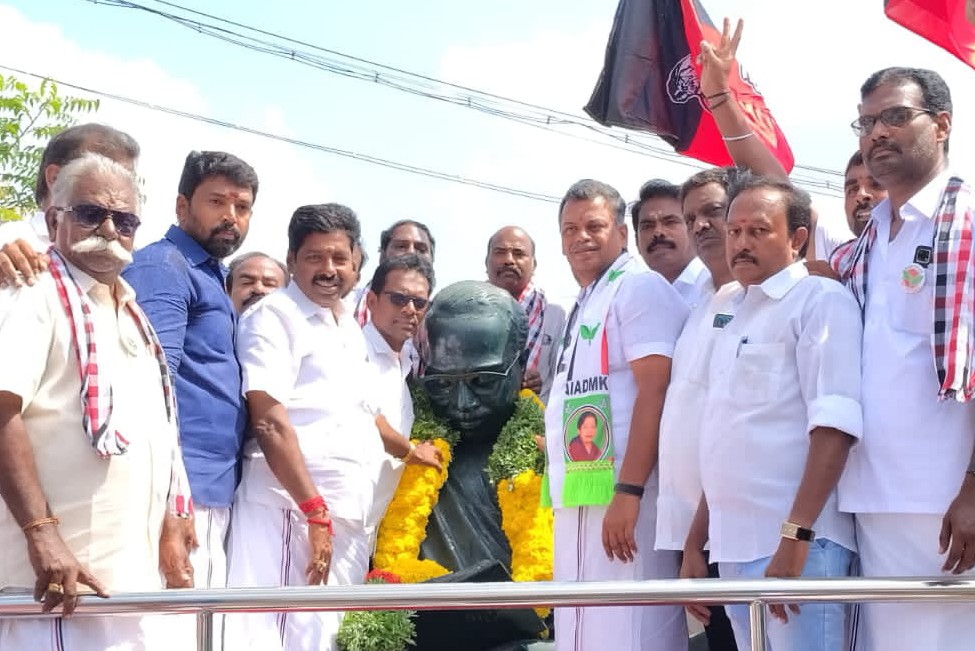 அதிமுக மாவட்ட செயலாளர் சீனிவாசன் தலைமையில் பேரறிஞர் அண்ணாவின் திருவுருவ சிலைக்கு மாலை அணிவித்து மரியாதை செலுத்திய கிழக்கு தொகுதி வேட்பாளர் ராஜசேகரன்:-