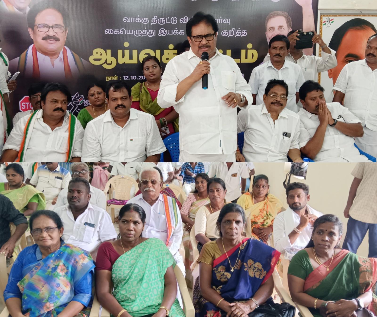 இந்தியாவில் வாக்குத் திருட்டு விழிப்புணர்வு கையெழுத்து இயக்க பணிகள் குறித்து காங்கிரஸ் நிர்வாகிகள் ஆய்வு கூட்டம் திருச்சி அருணாச்சலம் மன்றத்தில் நடைபெற்றது. நிகழ்ச்சியில் திருச்சி மாநகர் மாவட்ட காங்கிரஸ் கமிட்டி தலைவர் ரெக்ஸ், திருச்சி வடக்கு மாவட்ட காங்கிரஸ் கமிட்டி தலைவர் திருச்சி கலை, தெற்கு மாவட்ட காங்கிரஸ் கமிட்டி தலைவர் கோவிந்தராஜ் ஆகியோர் தலைமை தாங்கினார்கள் கூட்டத்தில் தமிழ்நாடு காங்கிரஸ் கமிட்டி முன்னாள் தலைவர் திருநாவுக்கரசர் கலந்து கொண்டு சிறப்புரை ஆற்றினார். அதனைத் தொடர்ந்து நிருபர்களுக்கு பேட்டி அளித்தார் அப்போது அவர் கூறியதாவது:- வாக்குத்திருட்டு குறித்து பொதுமக்களிடம் விளக்கி கூறி கையெழுத்து இயக்கத்தை நாடு முழுவதும் நடத்தி வருகிறோம், தமிழகத்தில் ஒரு கோடி பொதுமக்களிடம் கையெழுத்து இயக்கம் நடத்த ஏற்பாடு செய்து வருகிறோம்.சட்டமன்றத் தேர்தலுக்கு இன்னும் சில மாதங்களே இருக்கும் நிலையில் கூட்டணி குறித்து யாரும் கருத்து கூற வேண்டாம்.