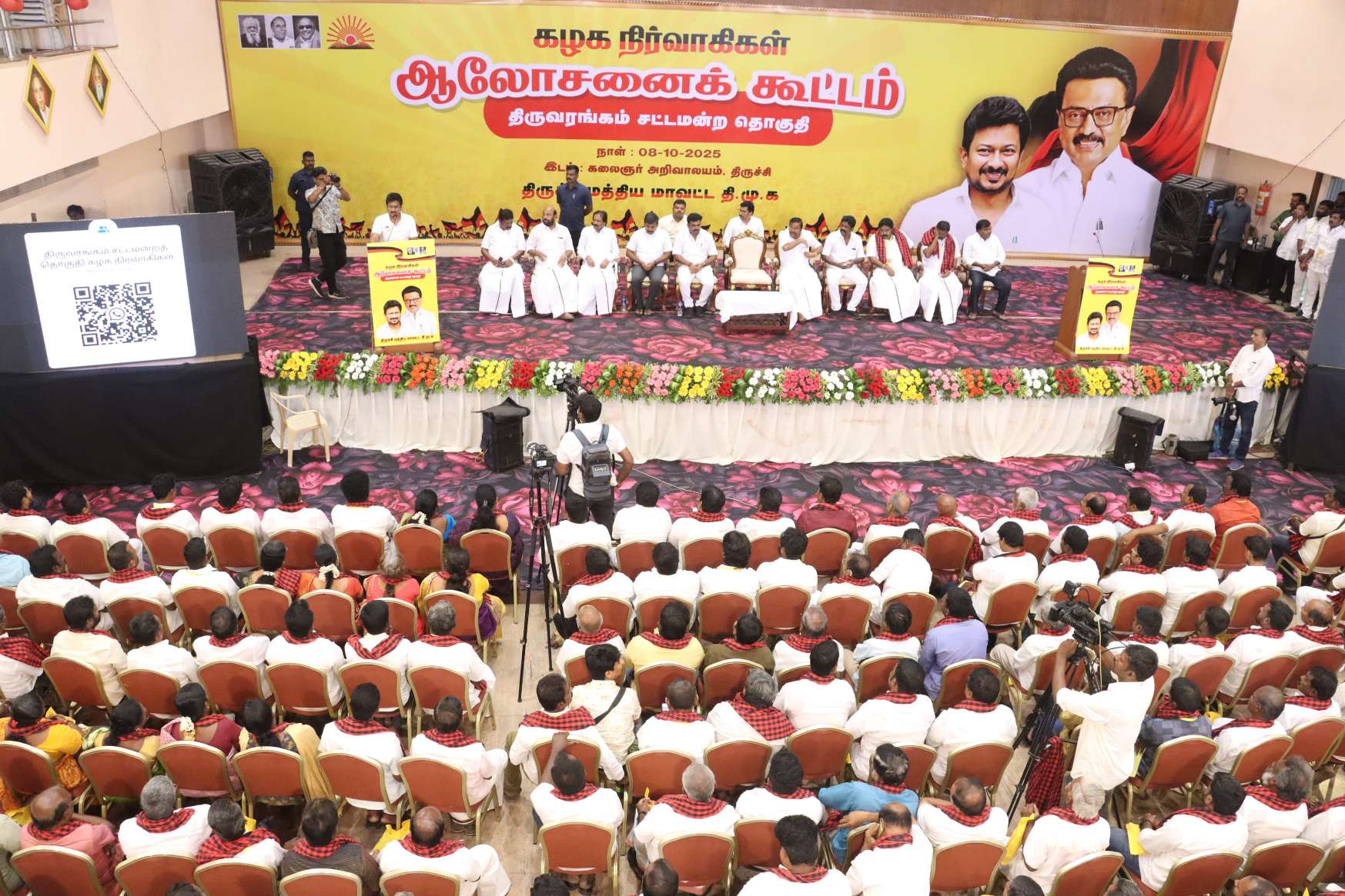பின்னர் தமிழ்நாடு துணை முதலமைச்சர் உதயநிதி ஸ்டாலின் திருச்சி கலைஞர் அறிவாலயத்திற்கு சென்றார்.அங்கு திருச்சி மத்திய மாவட்டத்திற்கு உட்பட்ட திருவரங்கம் தொகுதி திமுக நிர்வாகிகள் மற்றும் பூத் கமிட்டி ஆலோசனைக் கூட்டம் நடைபெற்றது.கூட்டத்திற்கு அமைச்சர் கே.என்.நேரு தலைமை வகித்தார்.மத்திய மாவட்ட திமுக செயலாளர் வைரமணி, மாநகர செயலாளர் மேயருமான அன்பழகன் ஆகியோர் முன்னிலை வகித்தனர். அதைத்தொடர்ந்து நிர்வாகிகளுக்கு தமிழக துணை முதல்வர் உதயநிதி ஸ்டாலின் ஆலோசனைகளை வழங்கி சிறப்புரையாற்றினார்.