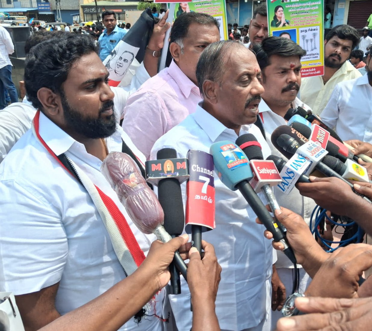 பர்மா பஜார் வியாபாரிகள் இன்றைக்கு வாழ்வாதாரம் இழந்து நடு ரோட்டுக்கு வந்திருக்கிறார்கள். அதே போன்று நடிகர் விஜய் சினிமா செல்வாக்கை வைத்து ஜெயித்து விடலாம் என நினைத்து இங்கு போட்டியிடுகிறார். இவர்கள் இரண்டு பேருமே வெளியூரை சேர்ந்தவர்கள். நான் இந்த மண்ணின் மைந்தர். என்னை வெற்றி பெறச் செய்தால் இந்த தொகுதி மக்களுக்கு என்றும் விசுவாசமாக இருந்து பணியாற்றுவேன். தேவையான அடிப்படை வசதிகளை நிறைவேற்றித் தருவேன். எந்த எதிர்பார்ப்பும் இல்லாமல் தேர்தல் களத்துக்கு வந்துள்ளேன். சசிகலா மற்றும் டாக்டர் ராமதாஸ் நல்லாசியுடன் நிச்சயம் வெற்றி பெறுவேன். என்னுடைய வெற்றி மக்களின் வெற்றி. இவ்வாறு அவர் கூறினார். முன்னதாக சென்னையிலிருந்து திருச்சி வந்த வேட்பாளர் நந்தகுமாருக்கு கே.கே.நகரில் பொதுமக்கள் மற்றும் தொண்டர்கள் பட்டாசு வெடித்து மேளதா ளங்கள் முழங்க உற்சாக வரவேற்பு அளித்தனர். மேலும் நிர்வாகிகள் மாலை அணிவித்தும், பொன்னாடை அணிவித்தும் வரவேற்றனர். அதன் பின்னர் கே.கே.நகர் இந்தியன் வங்கி காலனியில் உள்ள தனது இல்லத்தில் நந்தகுமார் அண்ணா, எம்.ஜி.ஆர், ஜெயலலிதா ஆகியோர் உருவப்படங்க ளுக்கு மாலை அணிவித்து மலர் தூவி மரியாதை செலுத்தினார். பின்னர் கட்சியினரின் வரவேற்பை ஏற்றுக்கொண்டார்