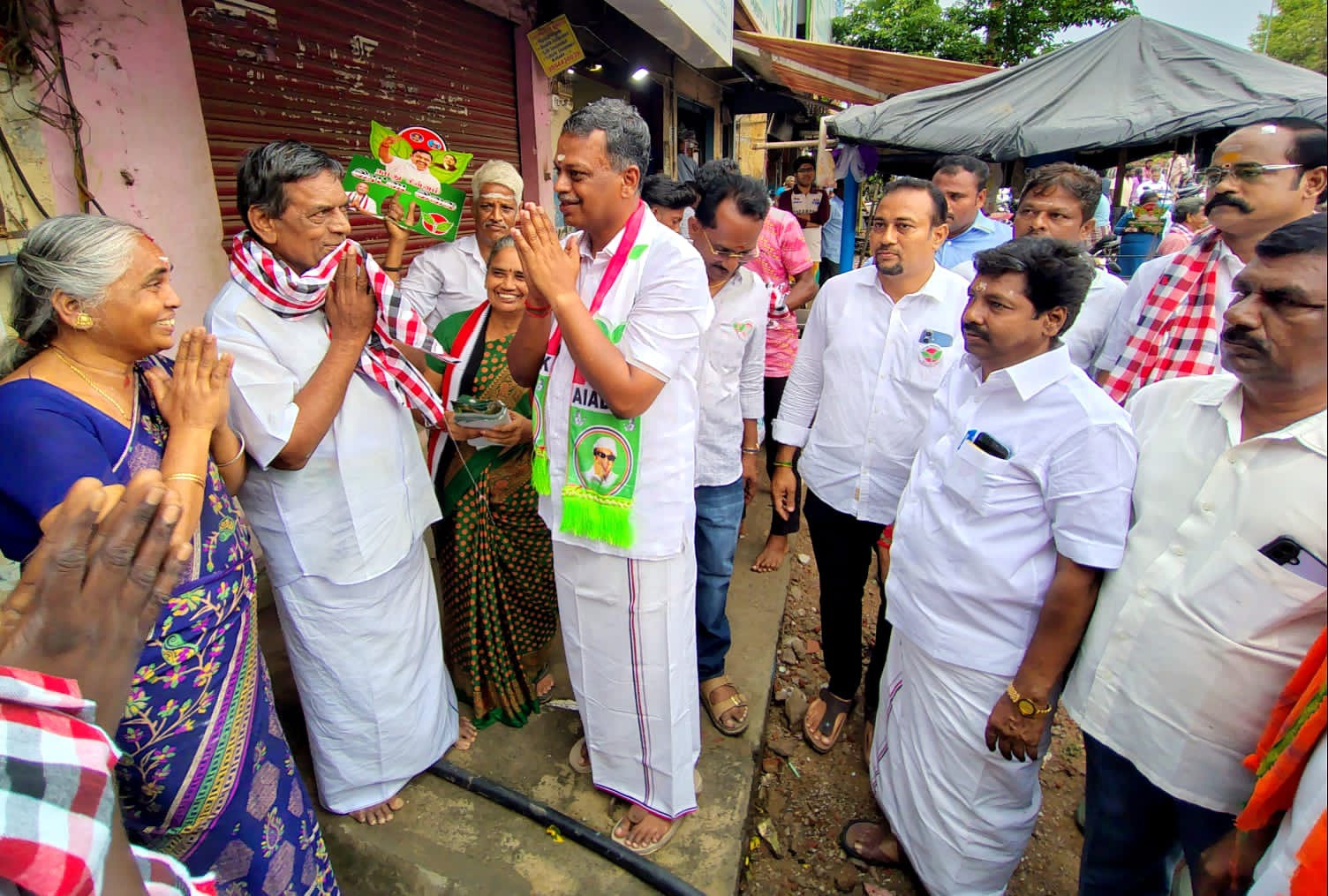 அருகில் அதிமுக திருச்சி மாநகர் மாவட்ட செயலாளரும், மாநகராட்சி முன்னாள் துணை மேயருமான சீனிவாசன் மற்றும் பகுதி செயலாளர் வெங்கட் பிரபு மற்றும் தேசிய ஜனநாயக கூட்டணி கட்சி நிர்வாகிகள் மற்றும் தொண்டர்கள் உடன் சென்று தீவிர வாக்கு சேகரிப்பில் ஈடுபட்டார்.