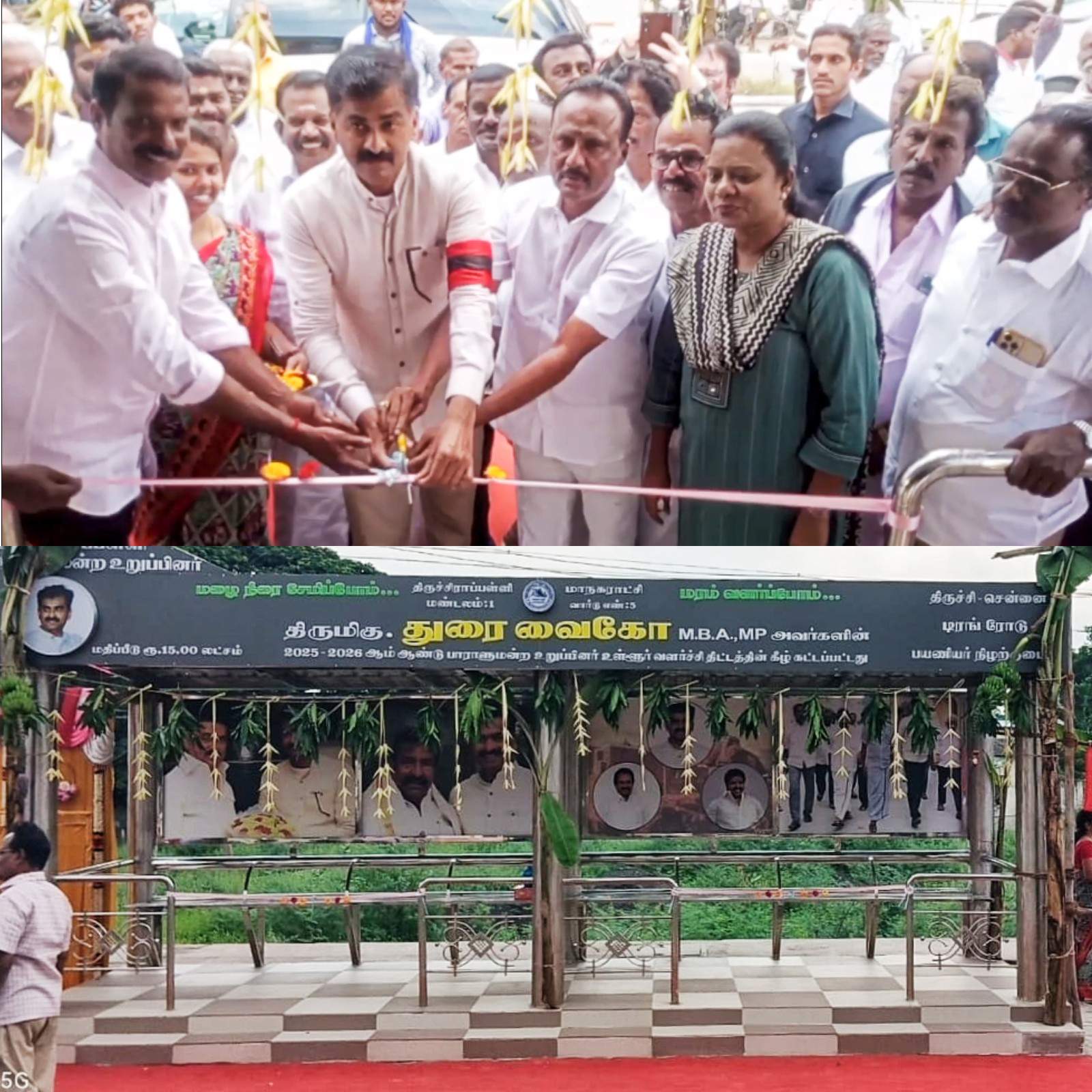 அதனை தொடர்ந்து திருவானைக்காவல் செக் போஸ்ட் ரவுண்டான அருகே திருச்சி பாராளுமன்ற உறுப்பினர் துரை வைகோ அவர்களின் உள்ளூர் வளர்ச்சி நிதி 2025 2026-யில் இருந்து ரூ.15.00 லட்சம் மதிப்பில் கட்டப்பட்ட பயணியர் நிழல் குடை திறப்பு விழா இன்று நடைபெற்றது. இந்நிகழ்வில் எம் பி துரை வைகோ கலந்து கொண்டு மக்கள் பயன்பாட்டிற்காக பயணியர் நிழற்குடையை திறந்து வைத்தார். நிகழ்ச்சியில் மதிமுக துணை பொதுச் செயலாளர் டாக்டர் ரொகையா, 5வது வார்டு கவுன்சிலர் முத்துக்குமார் நகராட்சி பொறியாளர் சிவபாதம்,நிர்வாக பொறியாளர் செல்வராஜ், ஆகியோர் கலந்து கொண்டனர்
