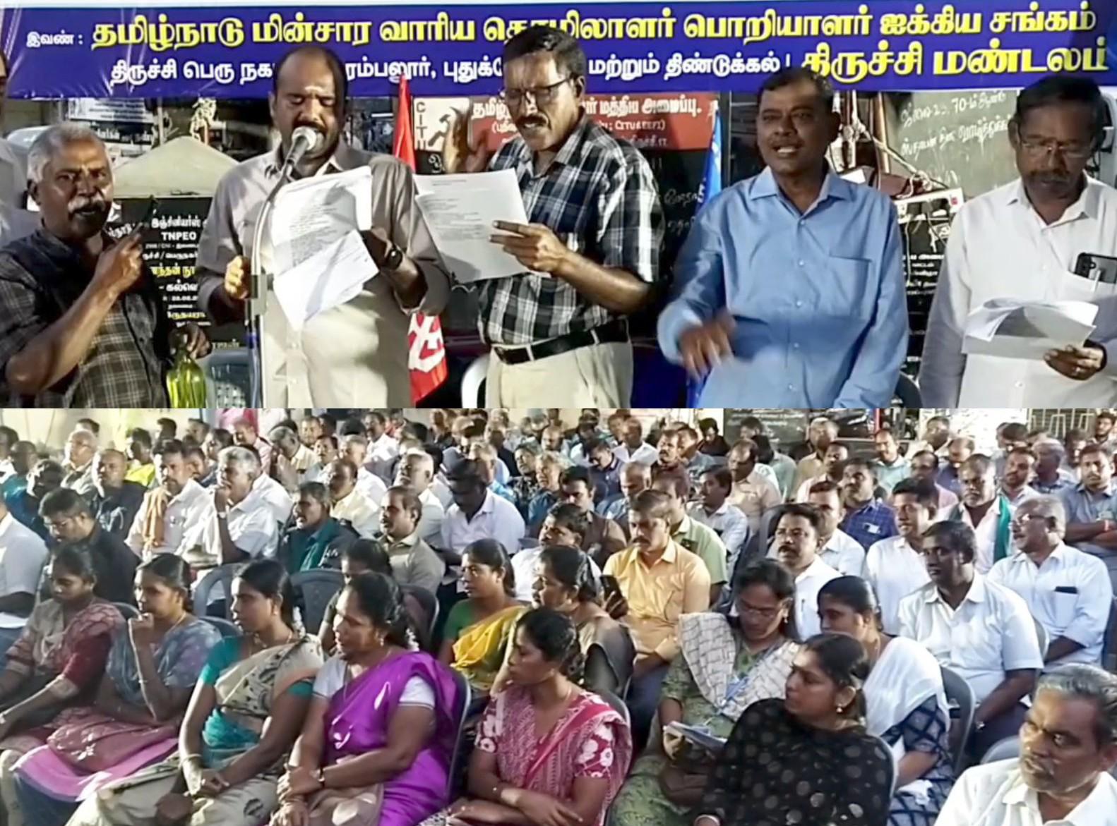 தமிழ்நாடு மின்வாரிய தொழிலாளர் பொறியாளர் ஐக்கிய சங்கம் சார்பில் பல்வேறு கோரிக்கைகளை வலியுறுத்தி திருச்சி தென்னூர் மின்சார வாரியம் தலைமை பொறியாளர் அலுவலகம் முன்பு கண்டன ஆர்ப்பாட்டம் இன்று நடைபெற்றது. இந்த கண்டன ஆர்ப்பாட்டத்திற்கு மாநில செயலாளர் முத்துசாமி தலைமை தாங்கினார் மண்டல செயலாளர் ஆலயமணி, மண்டல செயலாளர் கவிதா, செயலாளர் செழியன் ஆகியோர் முன்னிலை வகித்தனர். சிறப்பு அழைப்பாளராக மாநிலத் தலைவர் கண்ணன் கலந்து கொண்டு கண்டன உரையாற்றினார்.