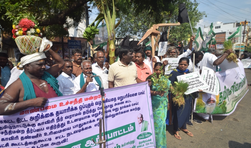 தமிழ்நாட்டின் பாரம்பரிய காவிரி தண்ணீர் உரிமையை பாதுகாக்க சட்ட வல்லுநர்களை கலந்து அனைத்துக் கட்சிக் கூட்டத்தைக் கூட்டி சட்ட நடவடிக்கை எடுக்க கோரியும், தமிழ்நாட்டின் 12 மாவட்டங்களில் வேளாண் உணவு உற்பத்தி காப்பாற்ற கோரியும், டெல்டா உள்ளிட்ட 22 மாவட்டங்களில் குடிநீர் ஆதாரத்தை பறித்து பாலைவனமாக்குவதை தடுத்திட கோர்வது உள்ளிட்ட பல்வேறு கோரிக்கைகளை வலியுறுத்தி தமிழக விவசாயிகள் சங்கம், காவிரி உரிமை மீட்பு குழு மற்றும் பொதுநல அமைப்புகள் சார்பில் கண்டன ஆர்ப்பாட்டம் இன்று நடைபெற்றது.