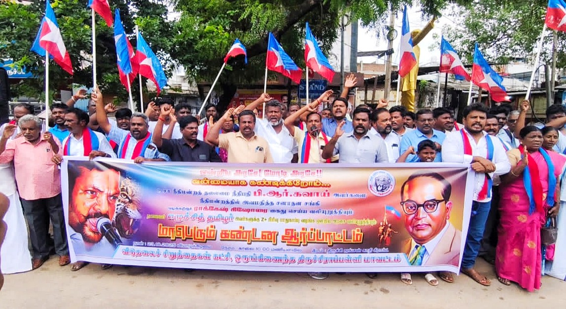 திருச்சி மாவட்ட ஒருங்கிணைந்த விடுதலை சிறுத்தைகள் கட்சியின் சார்பில் மாவட்ட செயலாளர்கள் புல்லட் லாரன்ஸ், கனியமுதன், சக்திஆற்றலரசு, வழக்கறிஞர் கலைச்செல்வன், குருஅன்புசெல்வன் ஆகியோர் தலைமையில் ரயில்வே ஜங்ஷன் எதிரே உள்ள காதி கிராப்ட் அருகில் கோரிக்கை வலியுறுத்தி ஆர்ப்பாட்டம் நடைபெற்றது. ஆர்ப்பாட்டத்தின் போது விடுதலை சிறுத்தைகள் கட்சியின் தலைவரும் சிதம்பரம் நாடாளுமன்ற உறுப்பினருமான, முனைவர் தொல் திருமாவளவனுக்கு மத்திய அரசு உடனடியாக இசட் பிளஸ் பாதுகாப்பு வழங்க வலியுறுத்தியும், தமிழக அரசு பரிந்துரைத்த வலியுறுத்தியும், உச்சநீதிமன்றத்தில் நீதியரசர் கவாய் மீது காலணி வீசிய வழக்கறிஞர் ராஜேஷ்கிஷோரை கைது செய்ய வலியுறுத்தி கோஷமிட்டு ஆர்ப்பாட்டத்தில் ஈடுபட்டனர்.
